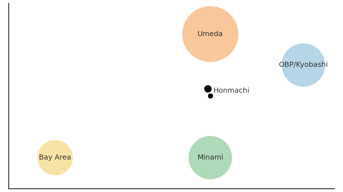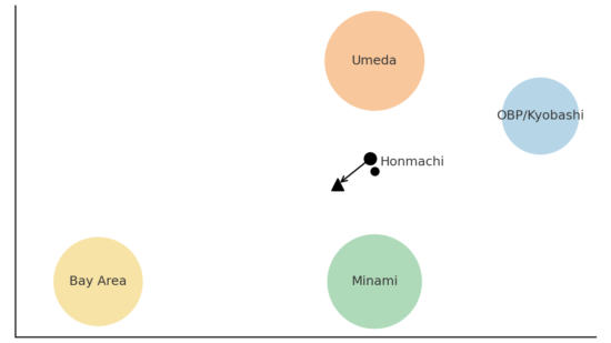 - 座標設定: 本町=(0,0), 梅田=(0,+2), OBP/京橋=(+3,+1), ミナミ=(0,-2), ベイエリア=(-5,-2)