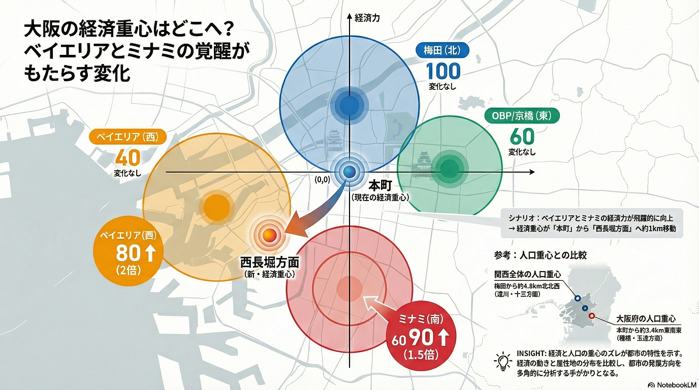 この変化は、概念図で可視化できます。変化前の重心(黒点)が、ミナミとベイエリアの「重み」の増加に引かれ、南西方向の西長堀方面(黒三角)へ移動していることが明確に見て取れます。
