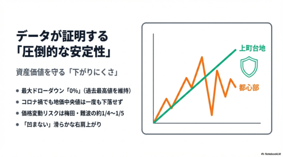 ここまで見ると、上町台地は成長性で少し見劣りするように感じるかもしれません。しかし、この「上がりにくさ」は、実は上町台地の最大の強みである**「下がりにくさ」**と表裏一体の関係にあるのです。次にその驚くべき安定性をデータで見ていきましょう。