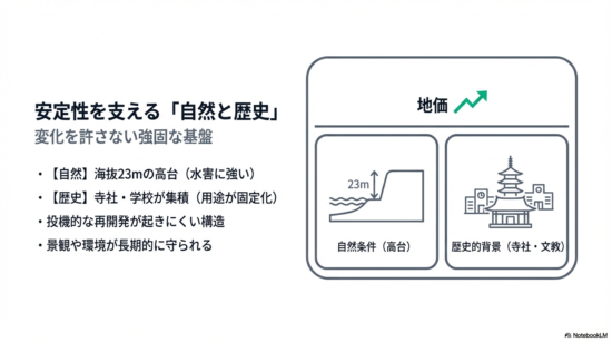 上町台地の地価が持つ驚異的な「底堅さ」。それは単なる偶然ではなく、この土地が持つ地形的な優位性と、そこに積み重なってきた歴史的な背景という、2つの強固な土台によって支えられています。